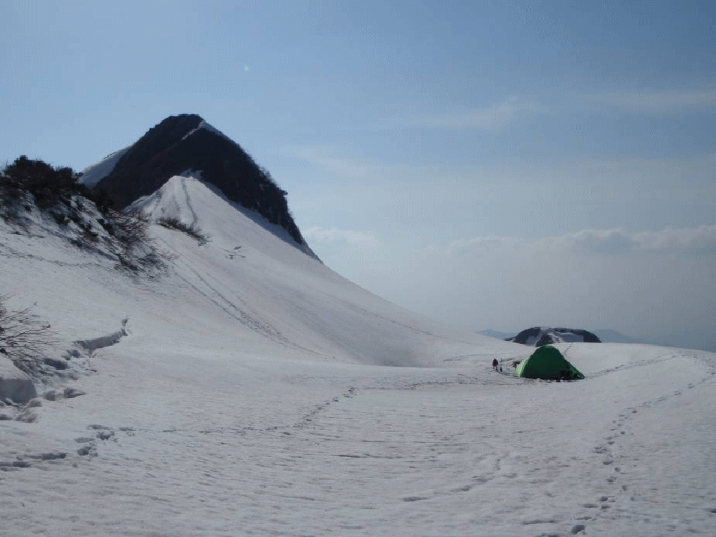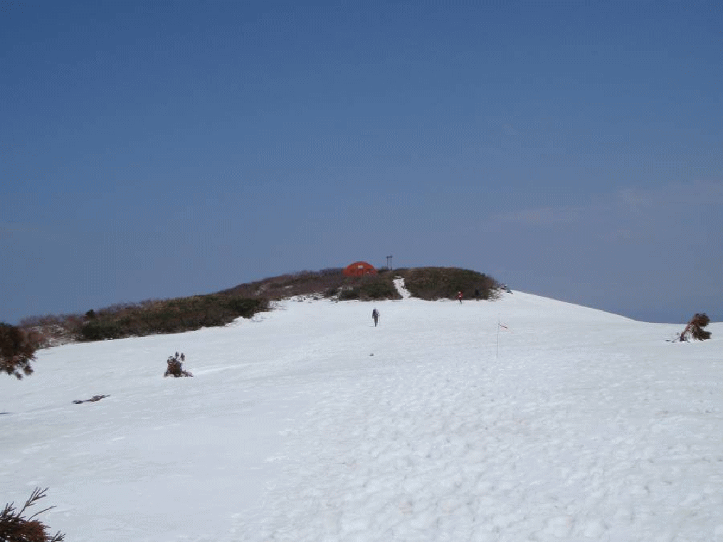 <5/3> 朝から快晴。雪が締まっているうちにと早発ちしたつもりだったが、昼間より少しはいいか、といった程度、アイゼンも無理していらない程度だった。すぐに尾根の方角が変わりヤンゲン峰に登りつく。目の前には赤津山が大きくそびえ立っていた。いくつかのピークを越え、1193m鞍部から200mちょっとの登りで山頂だ。雪の上を行けたので、最後の急登も助かる。ここがヤブこぎだったら、と思うとゾッとする。