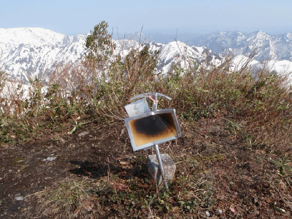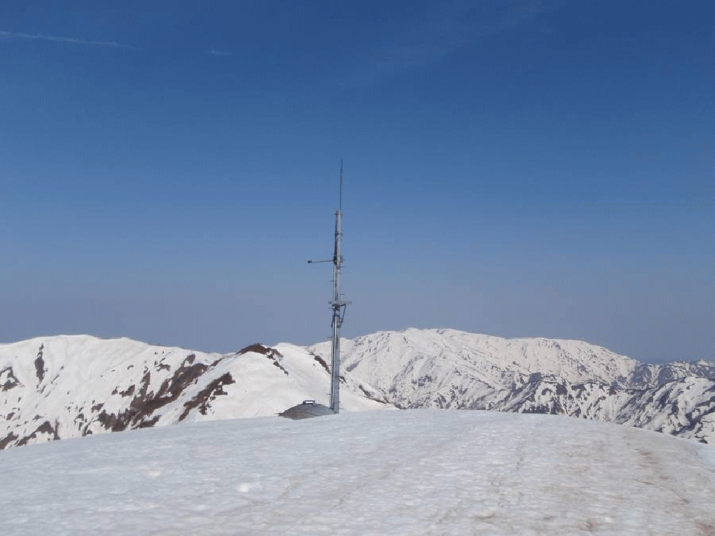 赤津山頂に立つ。20年くらい前になるだろうか。夏に立ったことのある山頂だった。雨量計?が建っていた、としか覚えていない山頂だった。最高の展望が広がっている。今回歩いてきた二王子岳からの尾根、これから歩く飯豊に続く尾根が見渡せた。行くにしろ戻るにしろ、長く遠い。飯豊連峰もこれでもか!くらいに大きく、そして真白く輝いている。大日岳は白光り!?していていた。出発しようとしていたら、豊栄山岳会さんが登ってきた。赤津から焼峰に縦走し、今日下山するそうだ。先回来た時から雨量計が赤津山頂だと思っていたが、そこではなく、少し東にいった所にある三角点を教えてもらう。