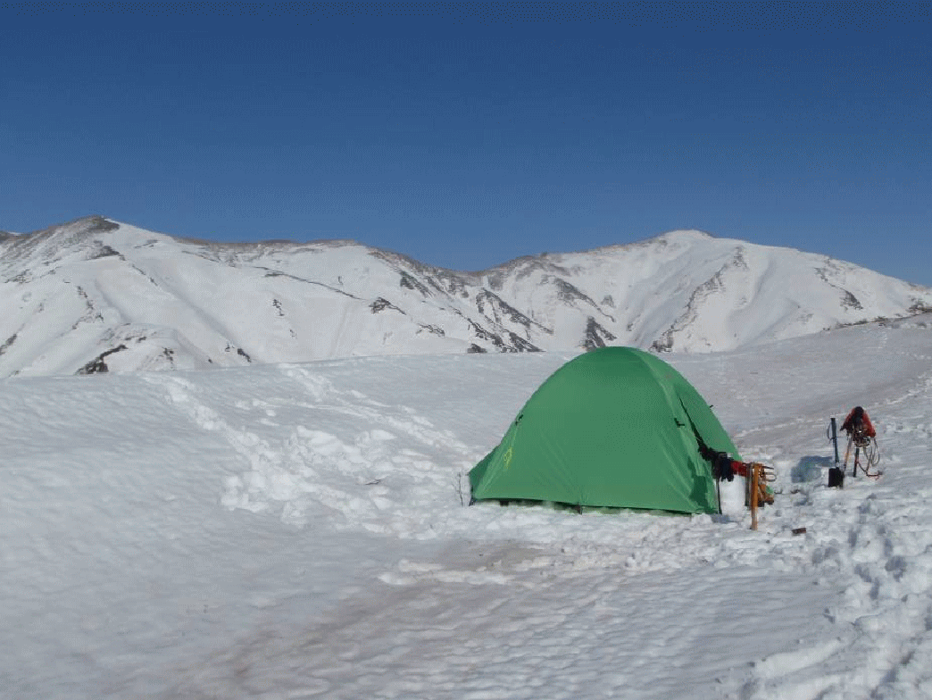 二本木山から1022mの鞍部まで雪斜面を一気に下る。ここから雷峰、桝取倉山を越えていく。今日はヤンゲン峰あたりまで行きたいと気は焦るが、小さなアップダウンの中、ヤブや歩きにくいトラバースなどが続き、距離を稼げなくなる。残雪が多くヤブの出現は少ないようだが、雪がザラメでやわらかく、時折もぐったり、足がとられてしまうなど疲れも増してきていた。赤津山まで同じ行程の豊栄山岳会さんがヤンゲン峰手前で幕営、私たちも少し先に行ったところ、尾根の方角が変わる1190mの台地でテントを張ることとした。夜は満天の星空となった。