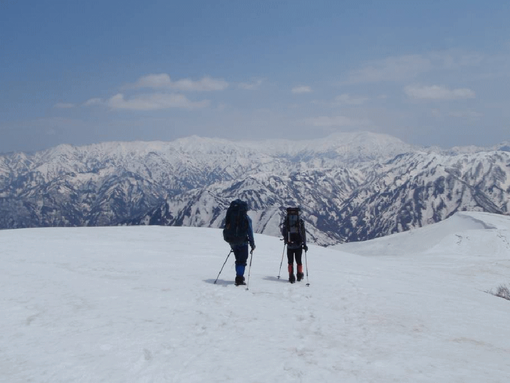 赤津山からは緩やかな雪の稜線漫歩となる。照り輝く飯豊連峰に向かって歩いていく。千石平、万石平も雪の下だ。藤十郎山直下で少しヤブが出ていたが、安定して雪の上を歩ける。距離が稼げるはずなのだが、歩みは遅く、休みが多くなる。今日の目的地である門内小屋まで行けるのだろうか。気は焦るが、足はなかなか進まない。行く先の二ツ峰は鋭くそびえており、仰ぎ見るといった感じだ。急斜面は雪が割れている。ヤブこぎ覚悟で二ツ峰直下まで近づくと、古いトレースは尾根の西側の樹林帯の雪を拾って付いており、幸せにもヤブこぎをせずに山頂に着いた。