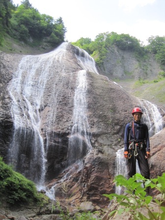 大滝を越えてからも、ナメ、深い釜などが続き、登れる滝も多くあきさせない。一度登っているのでさくさく進んで12時には登山道が交わる場所に着いた。巻いた滝は大滝を含め3つだった。装備を外し、昼食を取っていると、Gさんがやってきた。3人で団らんしていると賑やかな声が登山道から聞こえ、大勢の若者がやってきた。聞くと福島大の学生達で、授業の一つ沿いで上の山小屋に泊まるのだという。引率の先生もいた。彼ら(女子も数名いたが)も同じ場所で昼休憩をとったのでとても賑やかとなった。
