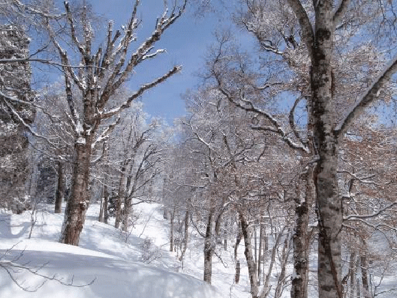 高陽山に登った時、今度は鳥屋森山に行こうという話になった。高陽山の東、奥川を挟んで立っている山だ。意識してみなかった山だったが、ブナ林が広がり、飯豊方面の展望も良いということで、11日に計画し、8人して登った。が、その時は山頂ではなく、南側の951m峰に登りついてしまった。視界が悪かったせいもあるが、唯一登ったことのあるメンバーを中心に慎重に登ればよかったのだが、ルートも知らない私たちがただ高みを目指して飛ばしてしまったせいだった。山頂に登れなかったこともあったが、どこで間違ったのか、また本来のルートも確認してみたく、今一度出かけることにした。11日のトレースも残っていてラッセルもしなくてよいだろう、天気も良さそうだからと、急で仲間を誘う間もなく、出かけた。
