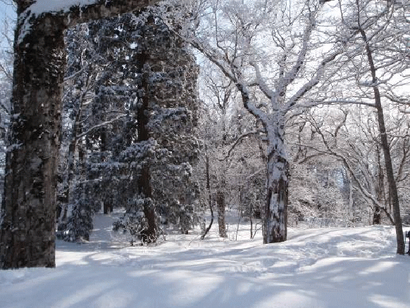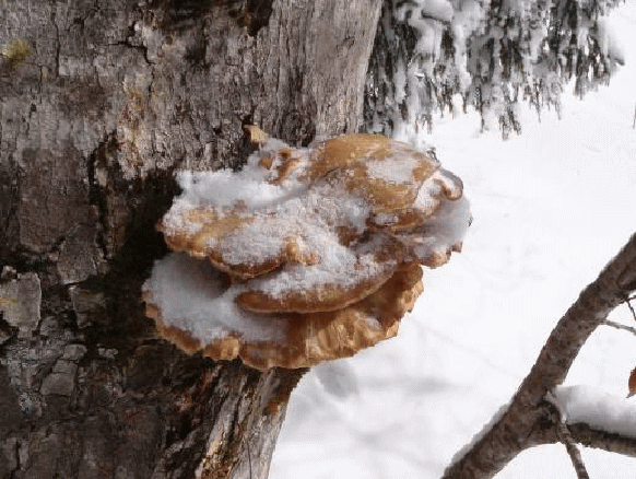 先回は天気のせいもあるが、針葉樹が目立ち、暗い感じの尾根の印象があった。今回は青空が広がる晴天だ。ブナの大木が点在するたおやかな斜面、枝の雪がキラキラ輝いて美しい。キノコでも、と思いあたりを見渡しながら登る。!!!あった、あった。ブナの立ち倒木にヒラタケがびっしりと付いていた。厳冬のカチコチのヒラタケだ。それも2箇所も見つけてしまった。先回大人数で来た時に見つけなくてよかった。すべてを独り占めできた喜びに浸ってしまった。ムヒヒ。