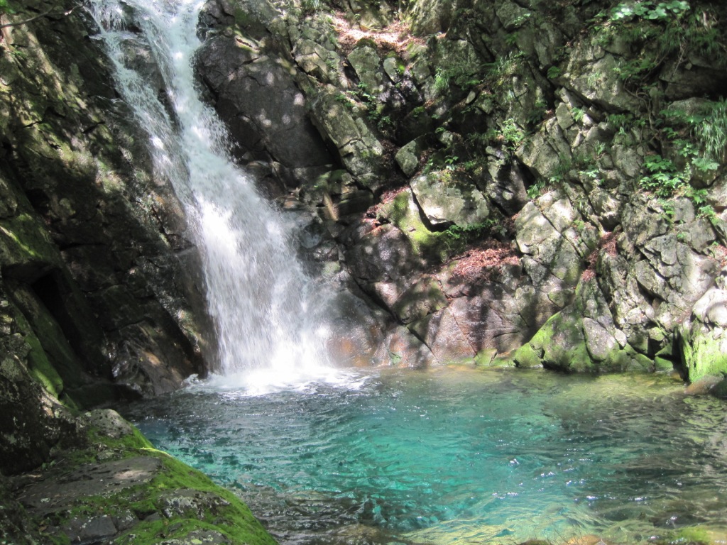 きれいな釜のある3段目の滝下で休憩をとった。木漏れ日が水面に入り、青く神秘的な景色となっていた。三階の滝を越えると沢床はナメ状になり、益々すばらしい。更に進んでいくと8m滝となる。傾斜はさほどでもないが、滑りやすそうだったので念の為ロープを出した。やがて登山道が横切る二股に着く。行く手の方向には八幡の滝がかかっているが脇の方から簡単に登れる。その先は黒色のナメ床となっていた。滑りやすい広い滝を越えて行くと、まもなく霧降りの滝となりここで終了点とする。入渓からここまで2時間半ほどで少々物足りない感じはするものの、総じてきれいな沢で満足だった。