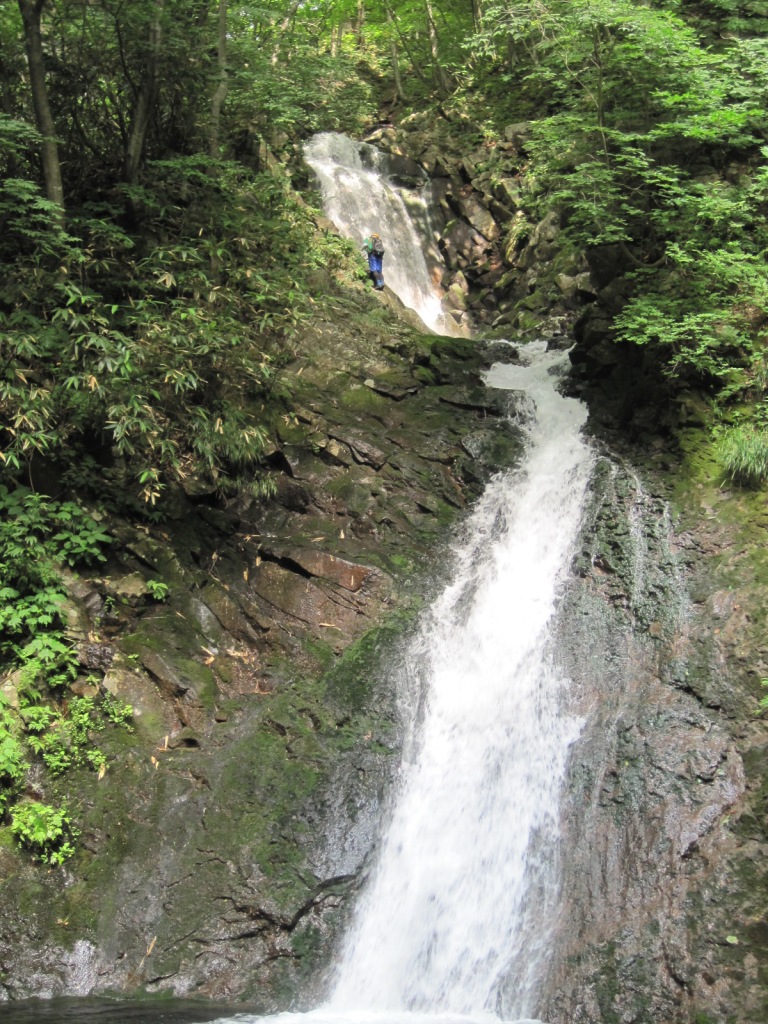 塩川スキー場の駐車場に車を止めて歩きだす。天気は快晴で気温も高く、すぐに体は汗ばんできた。10分位歩いて分岐を右にとり、馬返しと呼ばれる湯川の渡渉場所から入渓する。木漏れ日の緑の木々の中、穏やかな渓相で癒される。やがて最初の滝が現れる。5m位で左側から容易に登れるが、支点取りや確保の練習もかねてロープや金具類を取り出しセットしてみる。手際はあまり良くないが何事も練習だ。そうこう時間をとっている間に単独の人が追い抜いて行った。さらにしばらく行くと大きな滝があらわれた。ゆったりとした雰囲気から一気に緊張が走る。三階の滝と呼ばれているもので三段合わせると50mは有りそうだ。高度感があり、正面から見てとても登れそうにないので、すぐに高巻き道を選択する。しかし高巻の途中から見るとトップロープなら登れそうな感じがした。今度来る機会があったら必ず登ってみよう。