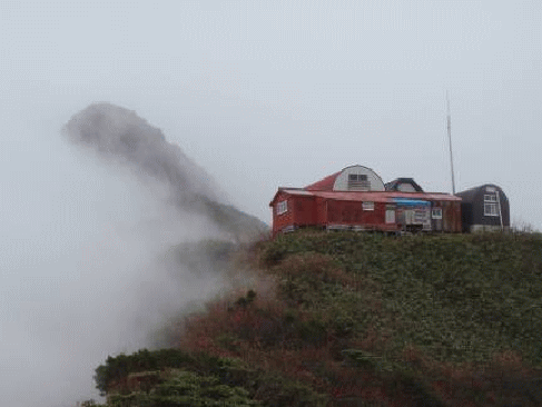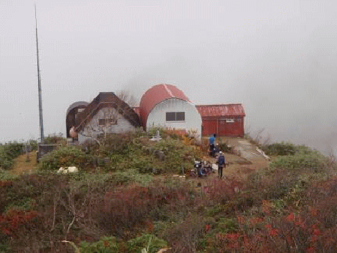 千本檜小屋周辺は大勢の登山者でにぎわっていた。私たちは八ツ峰のうち、地蔵岳をピストンしてくることにする。”天地人”のオープニングで、直江兼続役の妻夫木聡が立っていた峰だ。小屋からは10分ほどで着く。ガスっているので、視界はなし、高度感もない。あの時はにぎわっただろう山頂も静かだ。ここから八ツ峰縦走が始まるのだろう。今回は縦走の予定でもなかったので、隣の不動岳のみを往復し小屋に戻った。