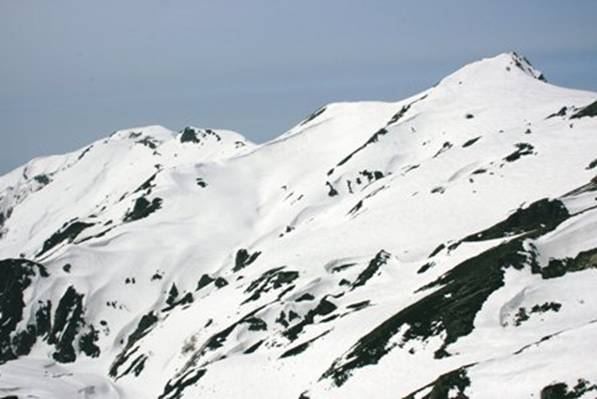 〈小日向のコルへ向かう途中から鑓温泉方面を振り返る。滑降ルートは写真右上の岩稜の裏側を下りてくる。中央の黒く小さい「ノ」の字のところが鑓温泉〉