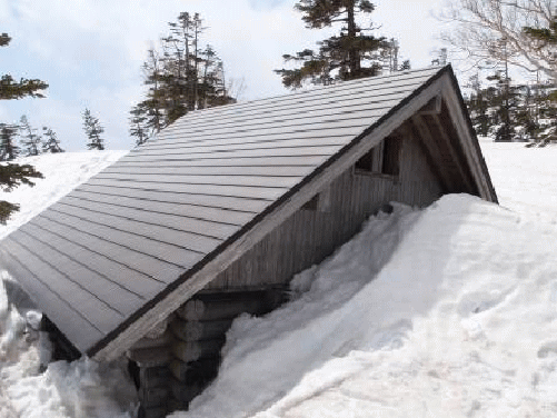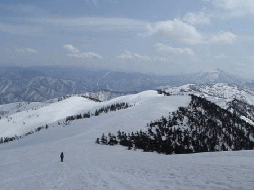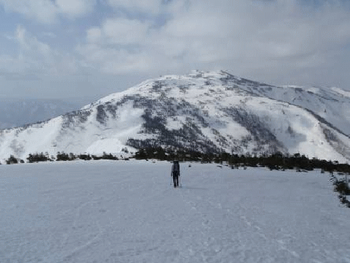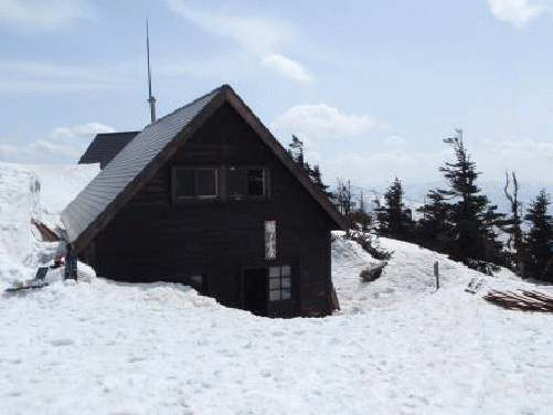 窓明山から窓明湿原にいったん下り、三岩小屋に向かって登り返す。小屋は半分以上雪に埋まり、使えない状態だ。三岩岳山頂ではガスの中となり、風が冷たく雨具を着て縦走路を歩き出す。十数年前の同時季に縦走したルートだった。こちらは標高差が少ない、時間的にもゆったりとしている。トレース跡がしっかりとついているので、この時季、縦走する人は多いようだ。少しずつ高度を上げ、大戸沢岳に着く。風が強く、雲の流れが速い。はやり丸山岳に行かなくて正解だったとひとり合点する。登山者の姿を確認できたと思ったら会津駒ヶ岳山頂だった。山スキーヤーが多く、スキーのトレースがものすごい。天気は回復しガスは晴れ、青空が戻り始めていた。駒ノ小屋は営業しており、登山者でにぎわっていた。この日は少し下りた樹林帯でテントを張る。昼間強かった風も夜には止み、夜中は満天の星空となった。