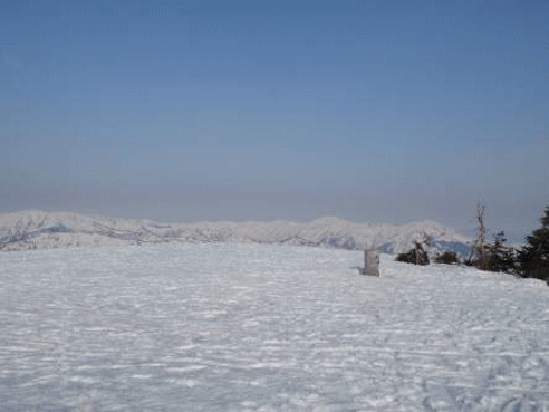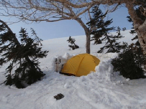 窓明山に着いた時は疲労困憊状態。こんなことで丸山岳まで行けるのだろうか。そうそうアイゼンがないと、早朝クラストしていたら出発できないかもしれない。でも、丸山岳に行けるのは今回がチャンスかもしれない。でも、もう歩きたくないなあ。などと、いろいろな思いが錯綜したが、とりあえずは北に向かおうと坪入山へ向かう。尾根が西に方向を変え、少し下ったところで単独の人に会う。丸山岳から縦走してきたそうだ。何時間くらいかかったか聞いてみると、「丸山岳の北側の肩から10時間」。??!!!情報としては仕入れていたのだが、実際に聞いてみてやっと実感する。坪入山から少し行ったところをベースにし、丸山岳をピストンしたいと言ったら、空身なので可能ではないですかとの返事。それでも片道6〜7時間はやはりかかるのだ。往路、復路ともアップダウンは同じなので、倍だと12〜14時間ととてつもなく長丁場だ。テントまで無事に帰ってこられるのだろうか、と心配になる。それでも今日の目的地までは行こうと気を取り直して歩く。坪入山から方角をまた西に変え、1754mピークにテントを張った。夜は星空はなく、夜半過ぎから風も強まってきた。