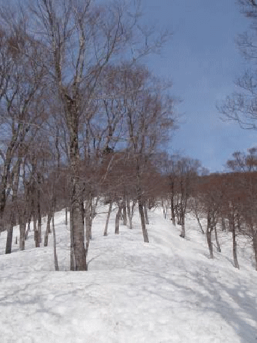 天気は晴れ。夏道の登山道を行く。登り始めが急で、ここでバテ気味となる。尾根が広くなり始めたあたりから雪が出始め、家向山へのブナ林の登りから雪道となった。アイゼンを付けた先行者がいるようだ。相方が「あっ、アイゼン忘れた」がつぶやくが、気にも留めずに歩く。家向山分岐からいったん下り、そこから窓明山頂まで400mの登りとなる。荷物が重く、ブナの素晴らしい原生林の斜面も景色を楽しむ余裕などない。いくら歩いても山頂に到達できないように感じる。青空だった空も高曇りとなり、風が冷たい。