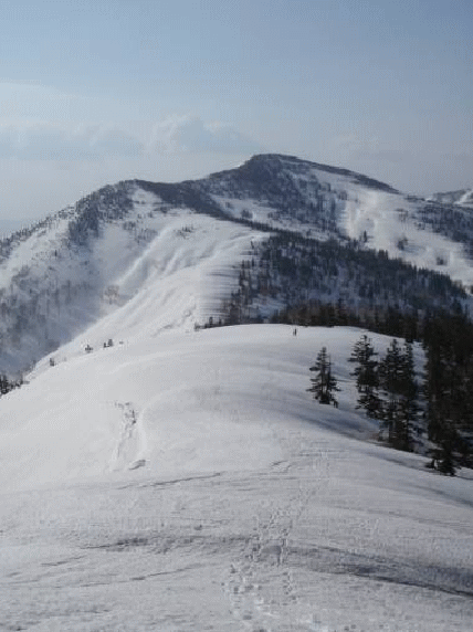 翌日は晴れ。さて、丸山岳ピストンをどうするか。テントの周りはクラストしていないようだか、尾根はわからない。早朝に出発しても明るいうちに帰って来られないかもしれない。と、消極的になってしまい、行く気は失せてしまっていた。ゆっくりと会津駒ヶ岳へ縦走することにし、テントを撤収して昨日のルートを窓明山に戻ることにする。丸山岳は遠くに見えた。いくどもアップダウンを繰り返した尾根の向こうにそびえ立っていた。そこだけ朝日に照らされて何をも寄せつけないような輝きを放っているようだった。