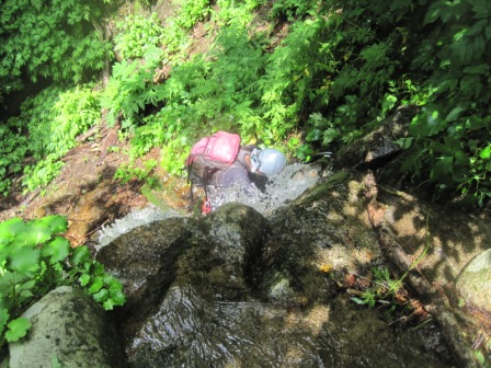 またしばらく行くと、大滝(18m)が現れます。前回は直登しましたが、今回は中間部分より、