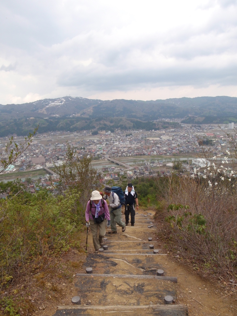 坂戸山登山口 AM10:45、 Y氏ご夫妻と合流する。9人で薬師尾根コースを登る。石仏を見ながら撫でながら公園のような登山道を歩く。30分程登って休憩。眼下に六日町の市街が広がっている。Y氏よりみかんを1ケづつ頂き喉を潤す。アー幸せ。階段状の登山道は整備されて歩きやすい。だが、だんだん体が重くなり足が上がらなくなってくる。申し訳ない程のゆっくりペース。先頭交代申し出るが、ゆっくりで良いとの事でそのまま登る。