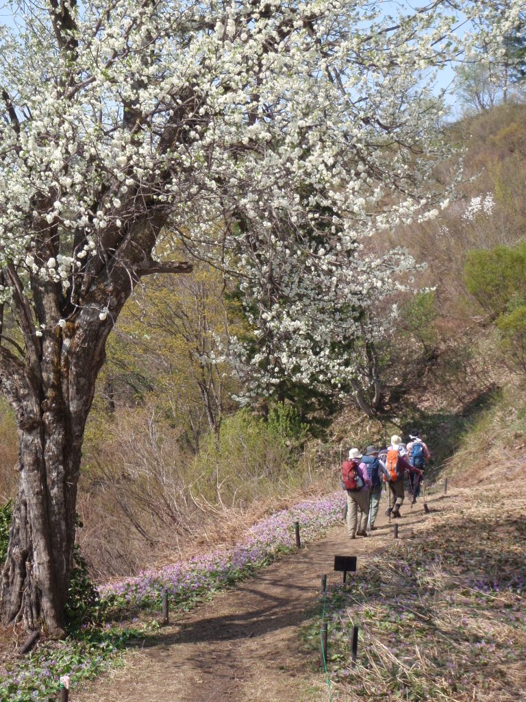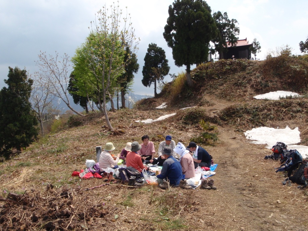 AM12:15山頂到着。八海山、金城山などの山々が美しい。2時間の宴会を楽しみPM2:20城坂コースを下山する。カタクリの群落が素晴らしい。ホー!! と感嘆する。のどかな春色の風に包まれて無事に駐車場へPM3:20帰着する。