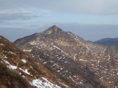 障子ヶ岳を見る。ピラミダルな山容で、カッコがよい。