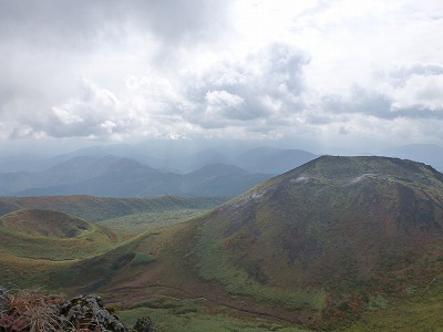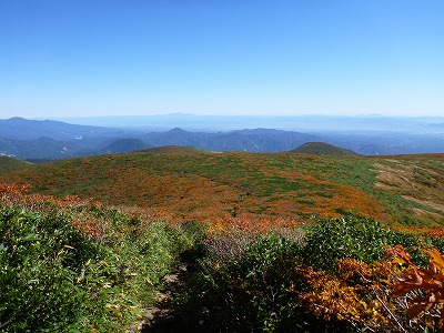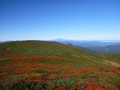 山頂手前からです。方角は鳥海山方向ですが、遠くに見えるのは鳥海山?なんでしょうか。