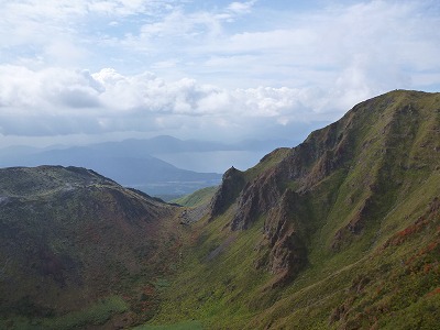 横岳に向かう途中で見た女岳(写真右側)と小岳(丸く窪んだところ)。女岳は1970年に噴火した跡で山頂付近からは蒸気のようなものが上がっています。今でも地表の温度は90度もある(A会長調べ)そうです。