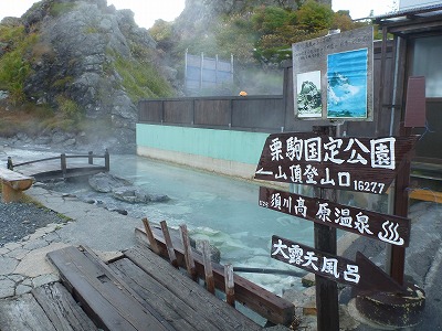 須川高原温泉の建物の脇が登山口です。温泉が川になっています。