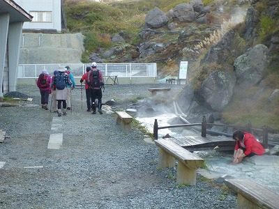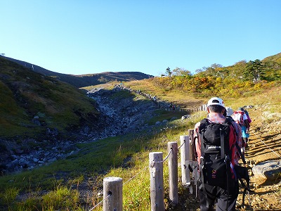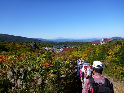 須川高原温泉の建物が見えてきました。ツアーの団体に追いついたので登山者の長い列ができています。