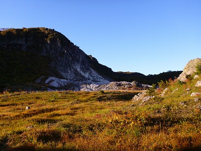 横岳で昼休憩の後、焼森コースで下山します。花のシーズンには焼森からの砂礫にコマクサの群生が見られる(そういえばバスターミナルの名称も「アルパこまくさ」でした)そうです。