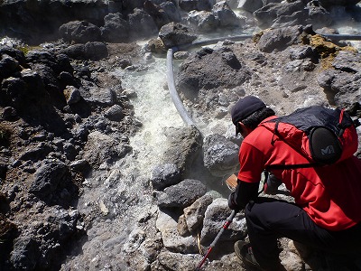 源泉の温度を探るS氏。