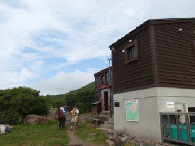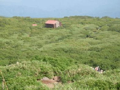 河原宿小屋の前で大休止とする。山頂に行かなかったひとりは月山森に登ってきたようだ。緩やかな起伏で登れ、静かな山を楽しめたようだ。月山森はマニアックな山だ≠ニ言われたと、ケロケロと喜んでいた。私も2年前に登ったが、お気に入りの山となっている。