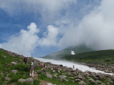 河原宿から心字雪渓を行く。心字雪渓は2箇所横切るだけ。雪渓では夏スキーを楽しんでいる。夏の名残の花々が残