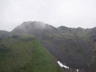 っているあざみ坂を登り切ると、伏拝岳となった。ガスが流れているが、外輪に続く新山が望めた。河原宿でひとり待っているので、すぐに下山にかかった。