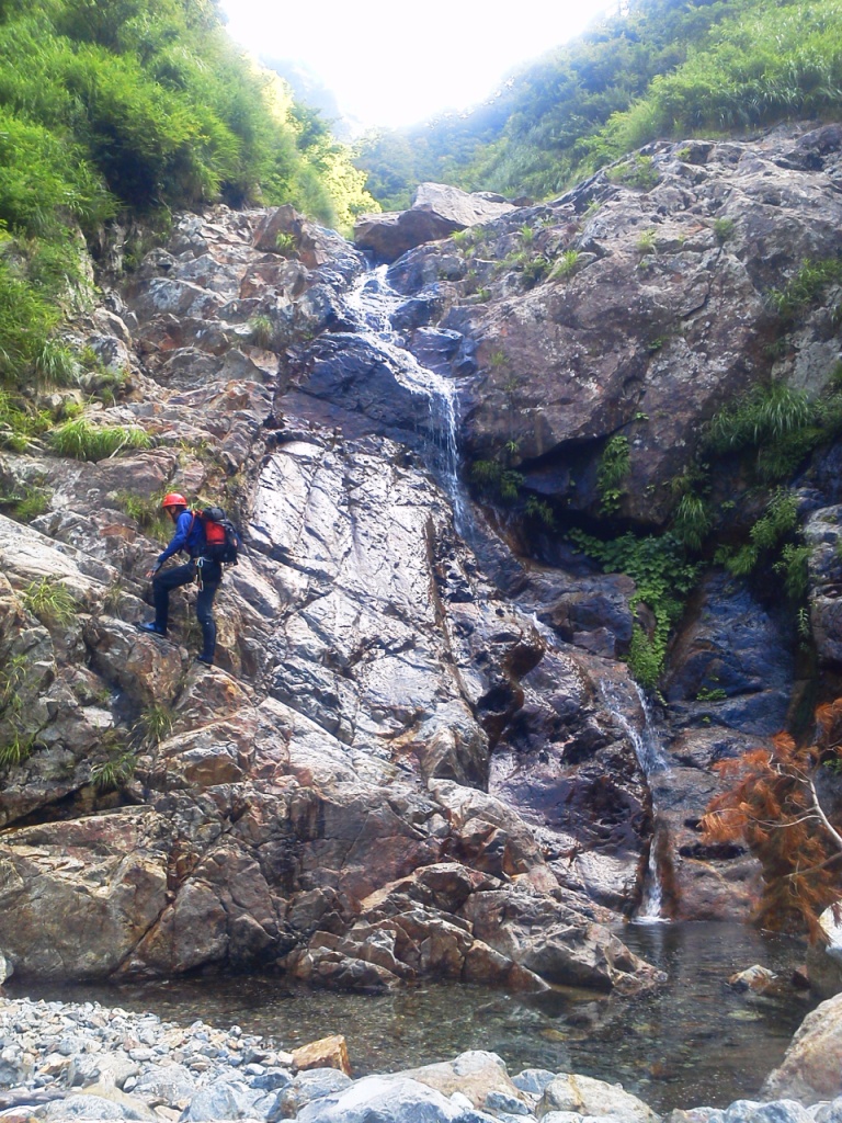 大岩が散らばり、水が流れていれば、滝だろうと思わせる場所を通過していくと、水の流れている7m位の滝となる。ここでは、A会長に上から確保をお願いし、水流の左を登ってみた。