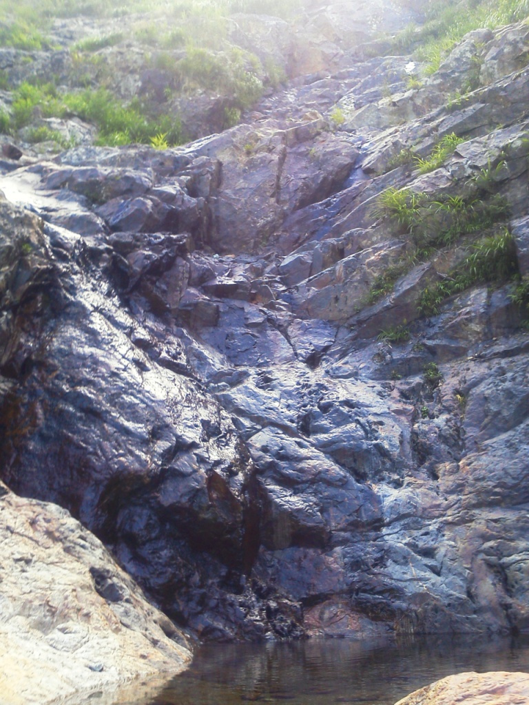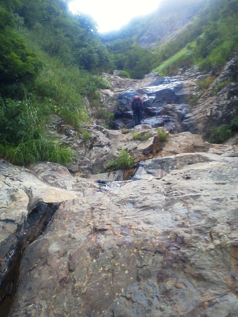 そして、ハイライトの30mのナメ滝だが、この滝は寝ていて、途中まではなんとなく登っていけるが、段々傾斜が増してきて上部の中央の水流寄りは手がかりがなく、ファイト一発状態になる。左壁のブッシュ沿いであれば問題ない。練習も兼ねて、ハーケンを打ち確保しながら登った。