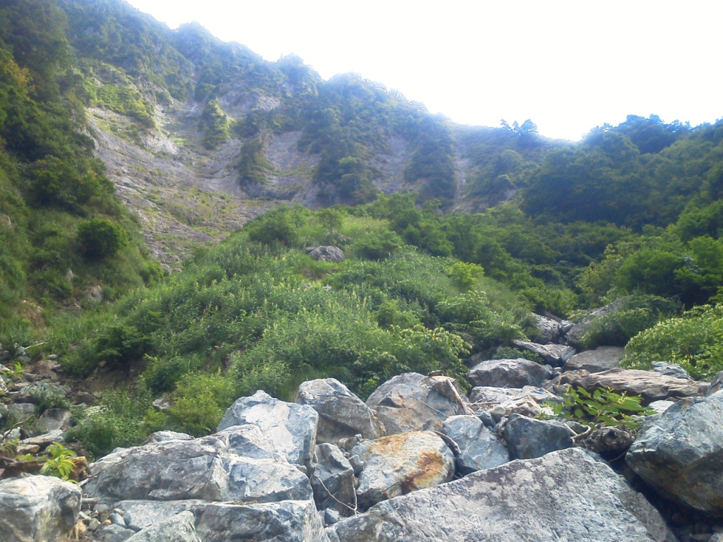 水も枯れ、干からびそうだ。最後の詰めは沢から途中で小尾根に乗り藪に突入。A会長について行けずバデバテの中40分位のきつい藪コギをして三合目と四合目の間の登山道に出た。出発から5時間もかかり、日向山に登っていたGさんを2時間も待たせてしまうことになった。