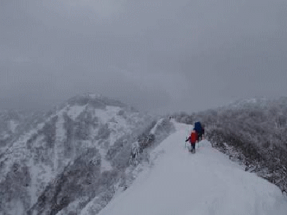 翌日も曇り。天候のよっては白山ピストンも考えたが、当初の予定通り縦走とする。縦走路途中で、青空が顔をのぞかせる。粟ヶ岳はじめ川内山塊の山々が見渡せ、歓声をあげる。縦走路は雪が多少締まったのだろうか。それとも荷が軽くなったのかな。昨日よりも歩きやすい。予定より早いペースで進み、思っていたよりも早く白山の避難小屋に着いた。小屋は2階からの出入りとなっている。天気は早くも下り坂で、雪が舞うガスの中の白山山頂となった。