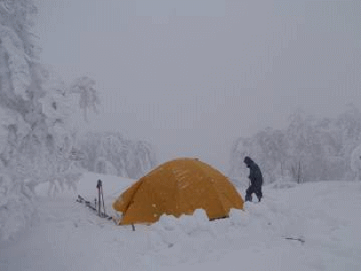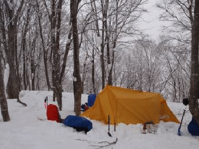 天気は曇りで視界は良い。木々の雪が落ちないので、気温は上がっていないようだ。山頂に近づくにつれ、ガスの中に入る。先行者のトレースのおかげで、思ったよりも早く宝蔵山の山頂に着いた。山頂の積雪は7、80cmくらいだろうか。夜は雲が切れ、月の灯りが明るい。新潟方面の街灯りのきらめきもきれいに見える。そして、テントの中はいつも通りの宴会で盛り上がった。