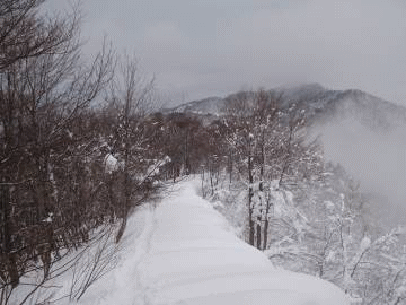 5合目でトレースが分かれていた。ひとつは慈光寺に下る田村線で、ひとつは神戸山に向かっている。神戸山に登る時に使う尾根を経由して、駐車場に下りるのだろう。下山に使うパーティーが多いらしく、しっかりとしたトレースが続いている。もちろん、神戸山方面に向かう。積雪期に神戸山に登る時に使われる尾根を知りたいし、地図上の空白部分を埋めたかった。