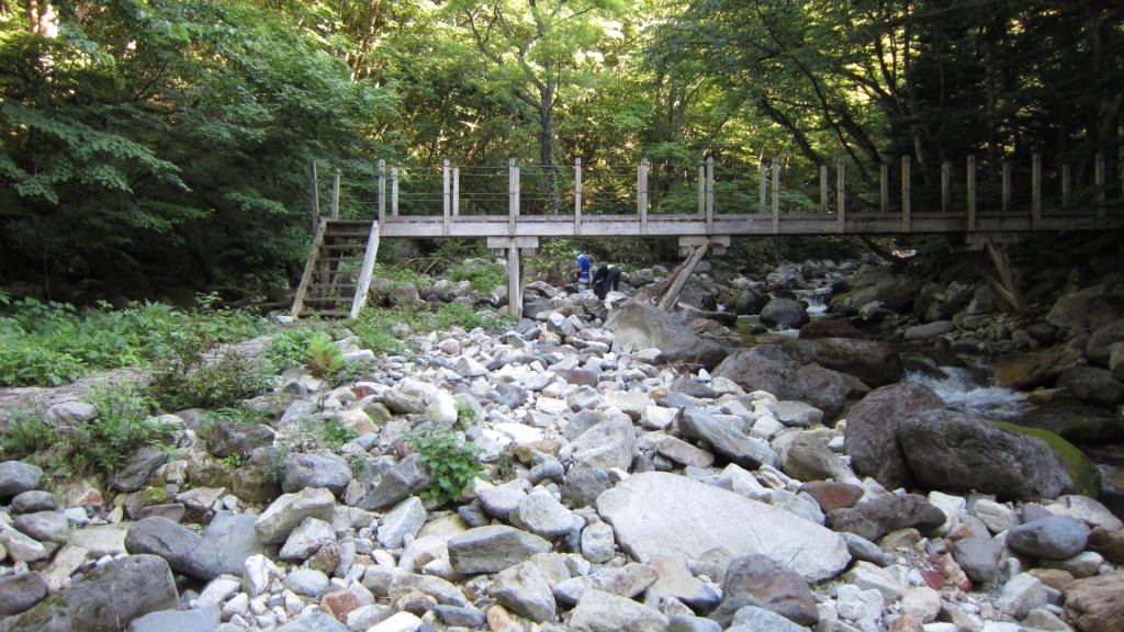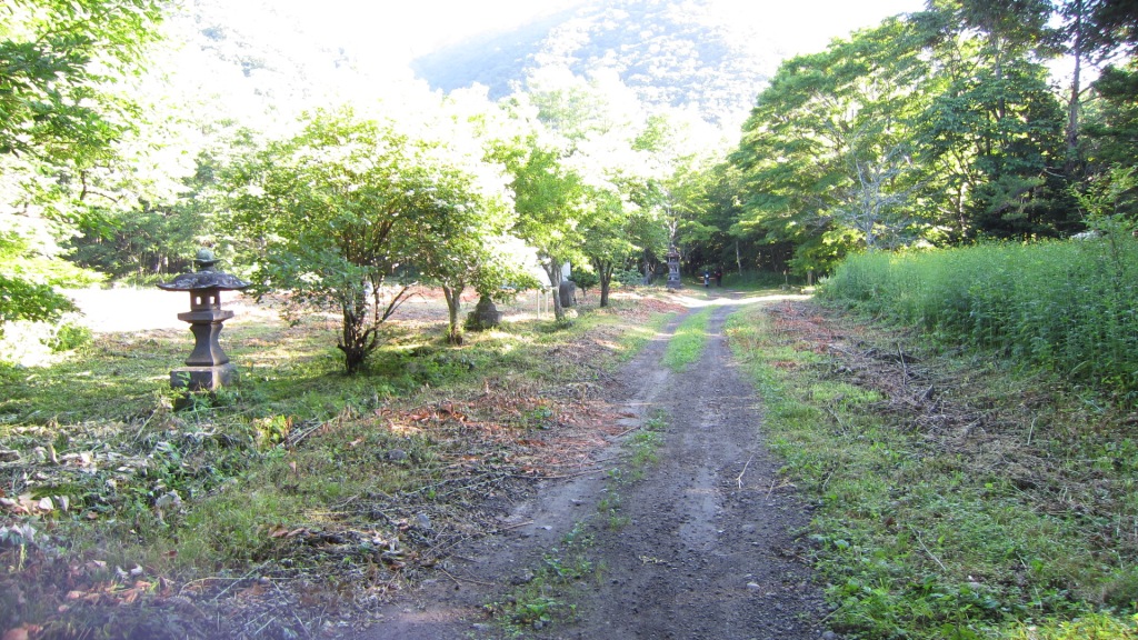 暗い中、早速テントを設営し、遅い夕食と宴会をして就寝する。翌朝4時30分に起床、朝食後、テントを撤収し車を林道の奥へと走らせる。去年駐車した地点に車を置き身支度を整えて出発した。小一時間ほど歩くと三斗小屋宿跡だ。