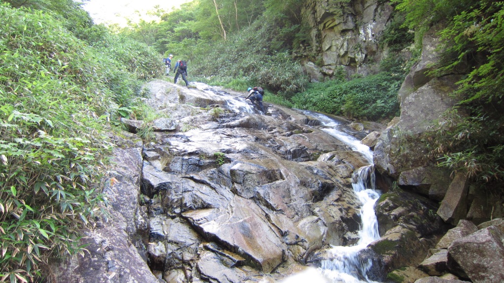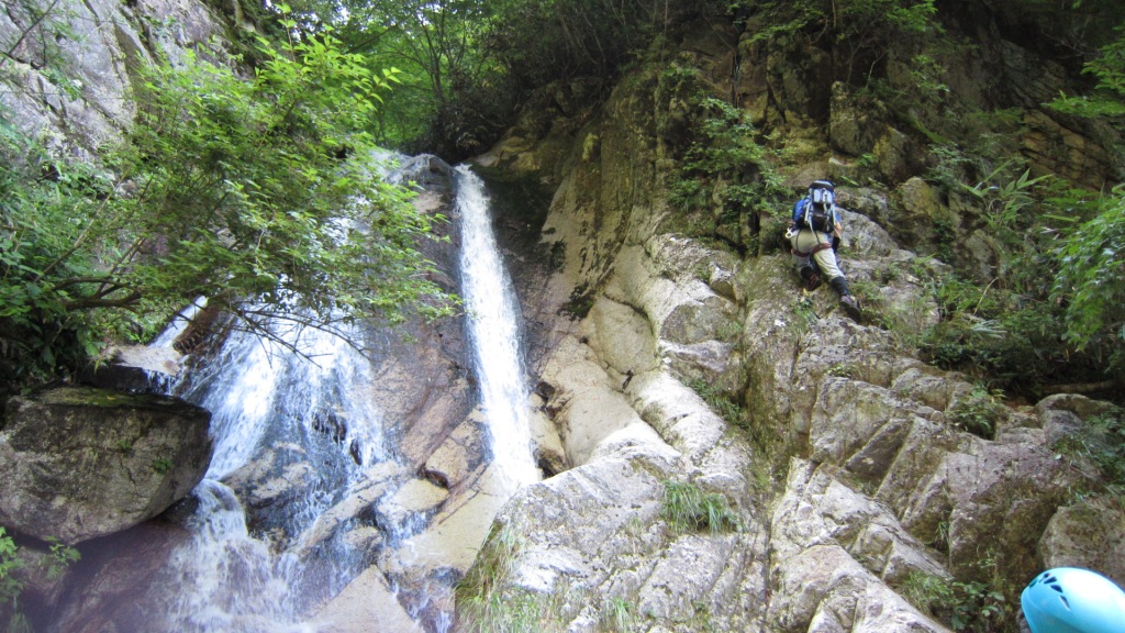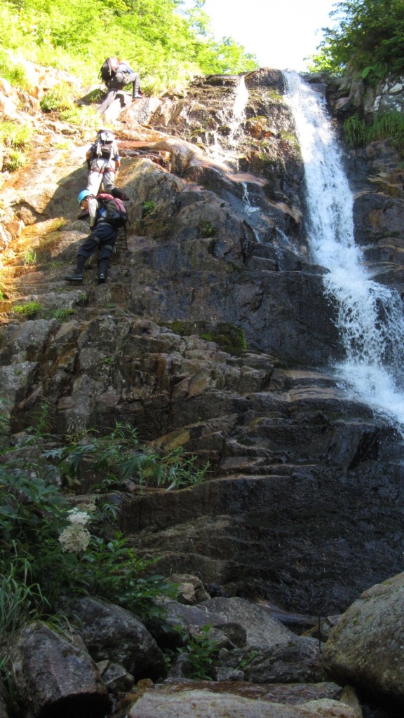 FとA会長が先に登る。左も行けそうだが、途中で行けなくなった場合に降りるのが厄介になると悪いので定石通り右のリッジを登っていく。中間のややハングぎみの所には残置のスリングがかかっているのでそれに掴まって乗り越える。その後も容易な滝が適当にかかり楽しく越えていった。