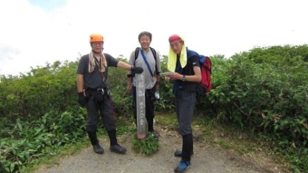 新潟の米子沢などに比べれば、小粒な沢であるが谷はあくまでも明るい。二股をすぎるとやがて沢は枯れ、ガレ場となる。ここからがやや長かった。水が切れた途端、どんどん力が抜けていき、へたれとなった。(A会長たちはどんどん先に登っていくので差は開く一方だ。)あえぎながら、笹の中の踏み跡を辿っていくと稜線に出た。少し休憩した後、流石山に向けて歩きだす。那須連山を見渡しながらの稜線歩で吹き抜ける風がとても気持ちいい。
