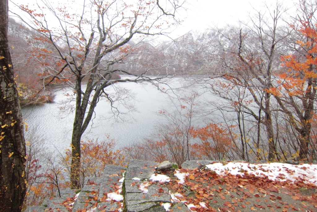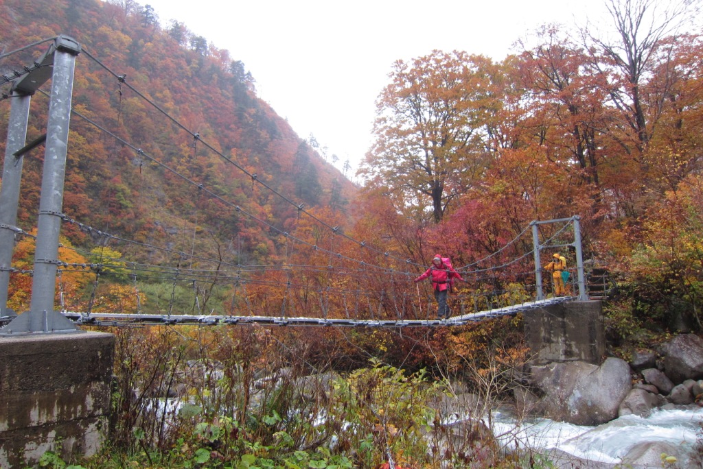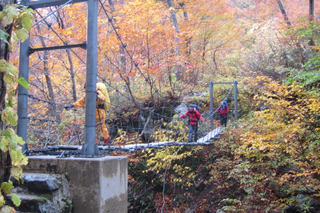 新潟を6時に出発、日本海東北自動車道で新発田IC~朝日まほろばIC間、いらがわIC~鶴岡間を高速利用したが、7年前に行った時とそんなに時間は変わらなかった。林道に入る手前にある朝日屋旅館に登山届けを出して泡滝ダムに向かう。泡滝ダムには十台程の車が留まっており、先行のA会長の車もあった。天候はあいにくの雨、雨具を着ての出発となった。大鳥池までの道は半分以上は標高差もあまりないので、息もあがることがない。紅葉と渓谷の組み合わせがすばらしい。天気がよければと悔やまれる。前方の山の標高の高い部分は白い雪をまとっていた。何人か下山する人とすれ違う、聞くと皆、きのこ採りのようだ。ナメコやクリタケなどを採取していた。