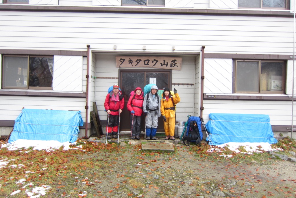 大鳥小屋(タキタロウ山荘)につくと、先行パーティのGさんとHさんがいた。きのこをとりながら登っていたようで、時間的には大差がなかったようだ。天候はみぞれ混じりの雨で、以東岳へ向かう登山道や山の斜面は真っ白。管理人の話では誰も登っている人はいないとのことだった。さすがの先行パーティの3人も以東小屋を目指すことは止め、近くのテンバにテントを張ることにした。我々は予定通り大鳥小屋に入る。