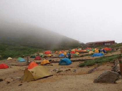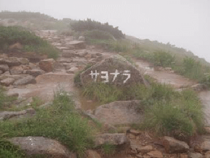 またも夜半過ぎから土砂降りとなる。雨漏りはなかったが、浸水はしているようだ。そして、朝になっても雨は止まず、深いガスに巻かれていた。昨日の期待は完全に裏切られてしまい、落ち込んでしまう。天気も悪いせいか、今回はテントも5張だけだった。ガスの中「サヨナラ」と書いてある岩にお別れし、テン場を後にした。