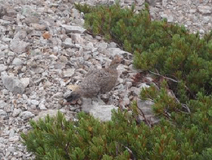下山も考えたが、小屋の天気予報を見ても曇りマークが続く。気持ちを奮い立たせ!!笠ヶ岳に向かうことにする。コースタイムは5時間ほど。ゆっくりと出発してもよいのだが、テントの中も大変な状態なので、雨の中早々に出発した。ガスの中は雷鳥の遊び場をなっている。登山道のあちこちで遭遇する。