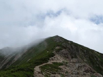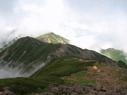 雨は降ったり止んだりで、天気は落ち着かない。途中で一緒になった女性2人パーティーと励ましあいながら!?歩く。秩父平を過ぎるあたりから時折雲が切れるようになり、抜戸岳分岐では青空が広がり雨具を脱ぐことができた。笠ヶ岳はまだ見えないが、稜線漫歩を楽しみながら歩くことができた。笠ヶ岳のキャンプ場はテントは数張だけ。雨が降ってきそうなので、すぐにテントを張る。
