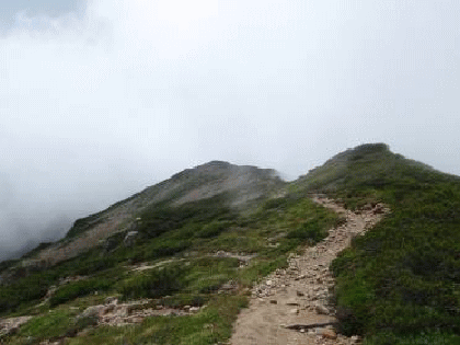 わさび平小屋を経て、鏡平に向かう。雨はシトシトではなく、ザーと降っては止み、しばらくするとはまた降るといった感じ。下山者が多く、「どうぞ!」と道を譲ってくれるので、息切れ状態。周りの景色を楽しむ余裕など全くなかった。鏡平は深いガスの中で視界はゼロ、雨も強まってきていた。晴れていればきれいなのだろうに。