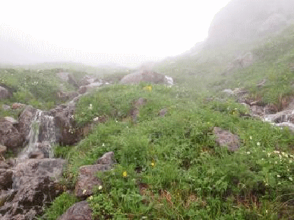 楽しみにしていた杓子平の展望ももちろんゼロ。水が流れるカールの中にお花畑が点在している。晴れれば笠ヶ岳や槍〜穂高方面が見渡せるのだろう。残念すぎて声も出ない。下るにつれガスが切れ、西穂高ロープウェーがよく見えるようになる。これでもか!と振り子のようにジグザグと続く山道をただひたすら歩き、やっと登山口の林道に着いた。