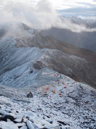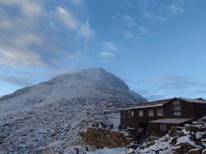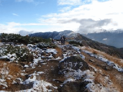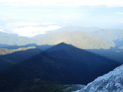 朝起きたら雪が積もっていた。初雪になるのだろうか。 昨日も寒く、雪がちらついていたなあ、と思い起こす。朝食を食べ(これも美味しかった)、山頂を往復する。雪ですべてが輝いていて、とても美しい。周りの山々は雲の中で展望が得られないのが残念だった。小屋に戻り山頂を振り返る。と、青空の中、笠ヶ岳がこれ以上ないくらいに輝いていた。こんなチャンスはもう2度とないだろうと、今1度山頂に向かう。周りの山々の雲はとれていないが、笠ヶ岳だけ晴れている。朝日に輝き逆さ笠≠ネるものも見られ、感激しきりとなった。