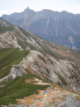 笠ヶ岳への縦走路は稜線漫歩を楽しめる。途中、何人かとすれ違うので、「どちらまでですか」と聞くと、「小屋泊まりの予定だったが、小屋が混んでいるので下山する」とのこと。「???」こりゃ大変だ、と急いで小屋に向かう。急いでも混んでいることに変わりはない、のだが。小屋に着き宿泊手続きをする。部屋は女子部屋で、混み具合で布団1枚に1人か2人だということだ。さっそく荷物を置いて、山頂を往復する。笠ヶ岳山頂からも360度の展望が広がっていた。槍〜穂連峰はもちろん、夏に登った焼岳も前の前だ。乗鞍岳と御嶽山が優美な形で美しく見える。