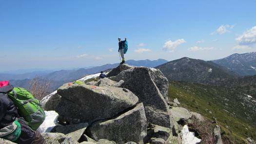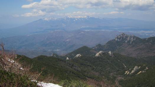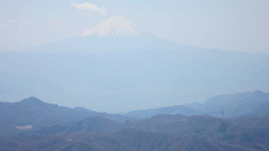3時間半を要して、ようやく山頂に到着。やや霞みがかっているものの快晴で見晴らしも上々だ。昨日登った瑞牆山(ここから見るとちょっとミニサイズ)、八ヶ岳連峰、南アルプス、富士山(霞んで白っぽい)の景色が圧迫感のない距離で広がっている。いい景色だ。