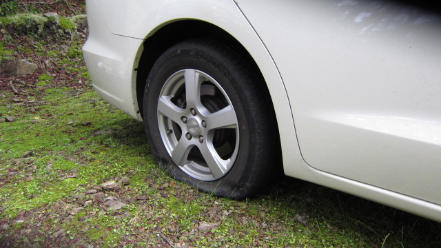「パ、パ、パンクだあ。」車を路肩に止め、心を落ち着かせ、使ったことのないパンクキットを取り出します。説明書を見ながら、補修液を注入し、コンプレッサーでエアーをプシューと入れますがタイヤは膨らまず、どこからかプシューと音がします。よくよく見るとタイヤの内側サイドに大きな切り傷がありました。パンクというよりバーストした状態です。どうやら崩れた鋭い岩石がタイヤの内側に巻き込まれてバーストさせたみたいです。思案にくれながら、宿に電話したりJAFに電話したりしましたが、山の中なのでいい返事が返ってきません。ジコ坊のNさんが通りがかった車を止め、女性のYさんと、Wooさんを宿に届けてくれと頼みます。さすがです。