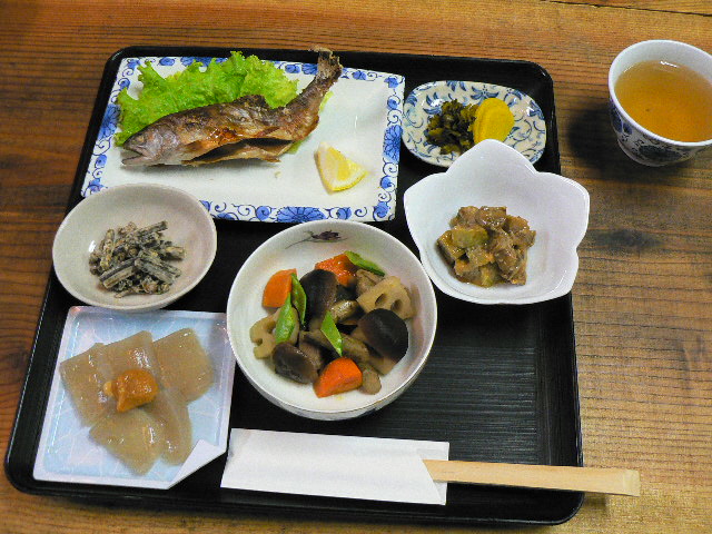 山の宿らしく、山の幸を使った夕食でしたが、美味しかった。板長さんがシシ肉ですといって猪の焼肉を出してくれました。少し固いものの野趣あふれるご馳走です。