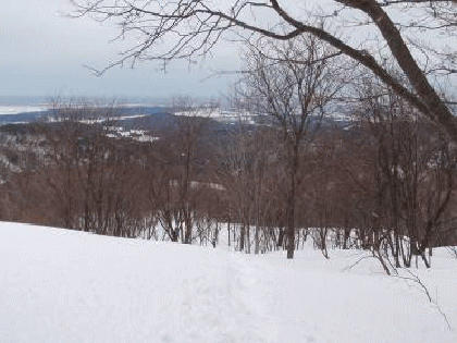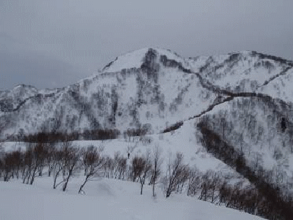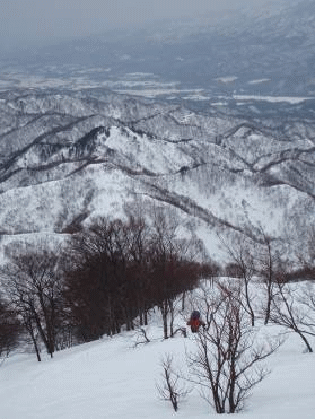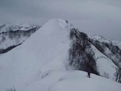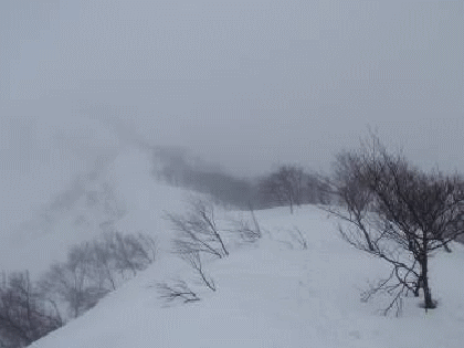 下山口となるだろうスキー場に車を1台投げ、登山口の剣龍峡に向かう。田家集落を抜け、除雪終了地点から歩き出す。高曇りの天気。30分弱で登山道に入る。足首ほどのラッセルだ。スズノロ展望台からは展望を得ることができたが、上に行くにしたがって雨となる。
